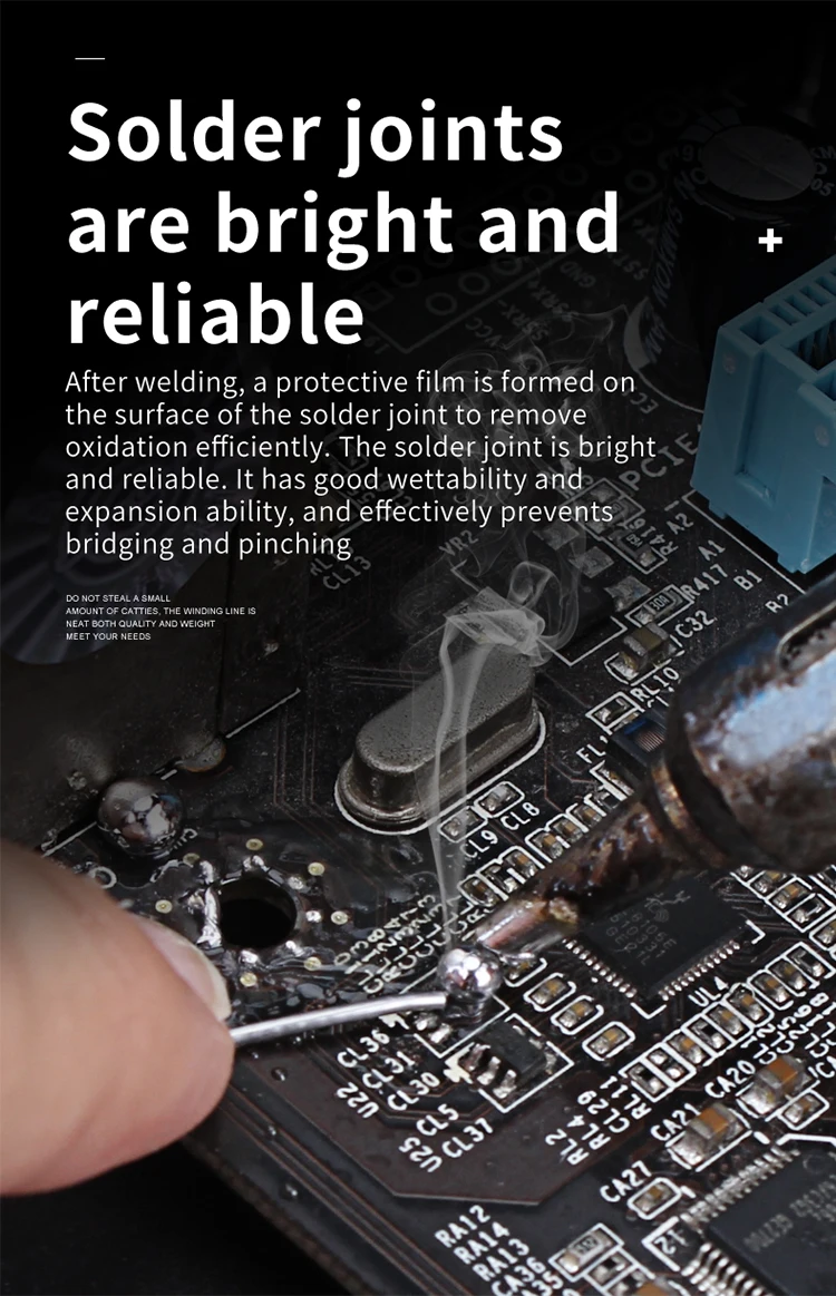 • دخان أقل ودفقة الصنوبري أثناء اللحام. نقاط لحام مشرقة وقوية. بالإضافة إلى وجود بقايا أقل بعد اللحام.