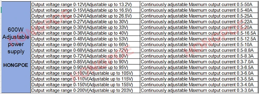 خرج الجهد: 0-12 فولت 15 فولت 24 فولت 27 فولت 30 فولت 36 فولت 48 فولت 60 فولت 68 فولت 72 فولت 85 فولت 90 فولت 100 فولت 110 فولت 150 فولت 200 فولت تيار مستمر